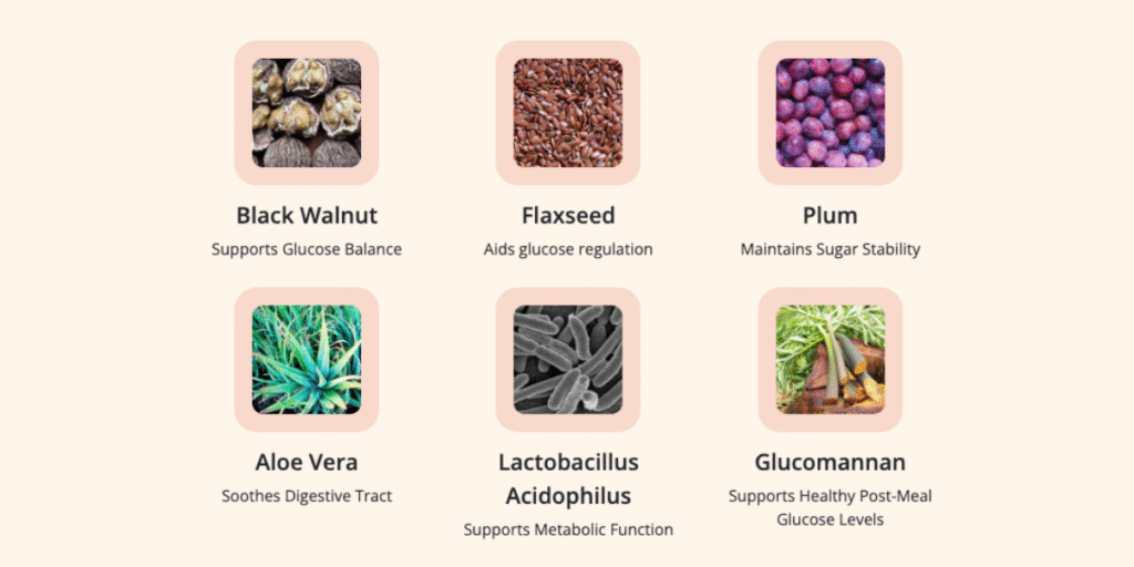 Unlike many synthetic alternatives, SugarMute uses a combination of flaxseed, plum, aloe vera, black walnut, and gluco­mannan, all known for their ability to support glucose regulation and improve gut health.